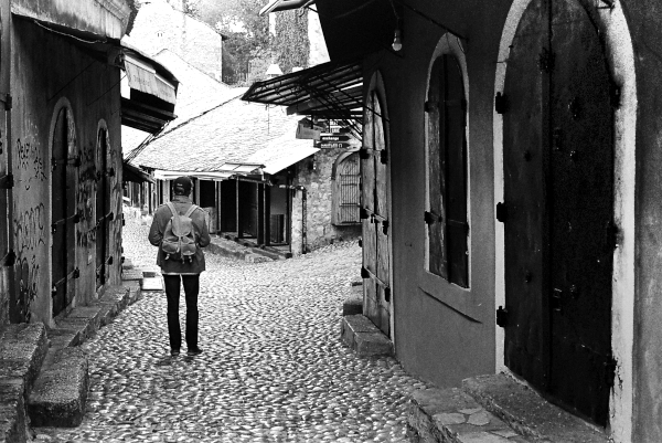 Przemierzamy stare miasto pochłonięci tą samą myślą: że z tej bałkańskiej wyprawy nie da się wrócić obojętnym. Przemożna potrzeba powrotu narasta z dnia na dzień. Ilford HP5 400/36, Leica…